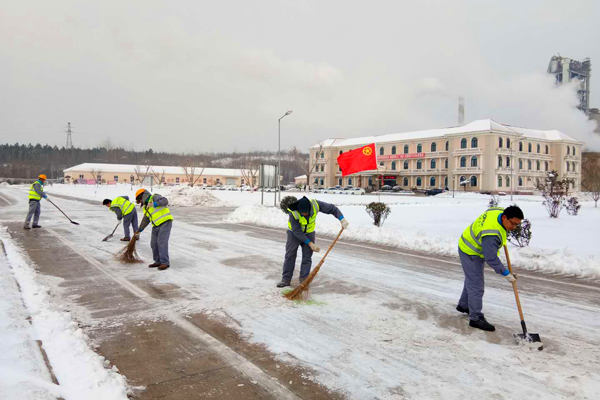 公司啟動應急預案,多次召開會議部署防范應對措施,提前落實了設備保溫防凍工作,對裝卸貨環節和廠內機動車輛加強安全管理、封閉巡檢廊道、樓梯危險路段、對原材料大棚實施定時觀測,并對廣大提貨客戶發布安全提醒。公司組織黨員突擊隊,帶領員工對廠區、后勤道路進行積雪清掃,以實際行動踐行“兩學一做”要求,有效保障了廠區主要道路安全通暢。