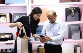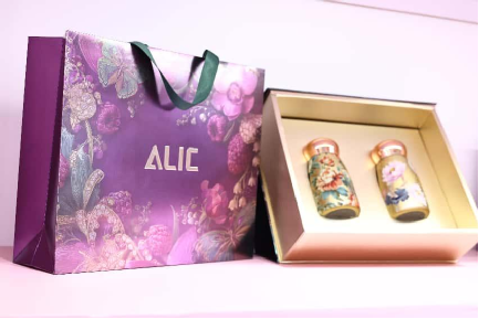 本次節日禮品展區設計別出心裁,產品花樣百出,其中最引人矚目的當數“ALIC瓶子禮品包裝袋”。該系列包裝選用環保材質,表面覆亞光膜,觸感細膩且具備良好的承托力。設計上以典雅紫色為底,搭配精致的花卉與靈動蝴蝶圖案,品牌“ALIC”標識采用燙白工藝,簡潔醒目。瓶身設計與手提袋圖案相互呼應,整體風格協調統一。蝴蝶意象不僅傳遞出“蛻變與新生”的美好寓意,也呼應了ALIC品牌持續創新、不斷突破的設計理念。據悉,該系列產品憑借其高顏值與實用性的結合,已吸引多國采購商駐足詢價,部分客戶已進入訂單洽談階段。