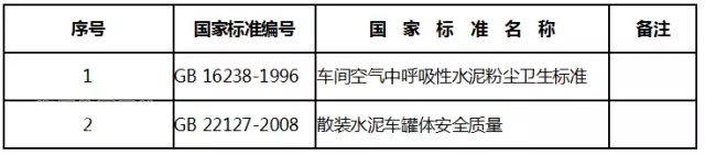 近期,國家質檢總局和國家標準委同時發布了2017年第6號公告,廢止了GB 16238-1996《車間空氣中呼吸性水泥粉塵衛生標準》和GB 22127-2008《散裝水泥車罐體安全質量》兩項標準。