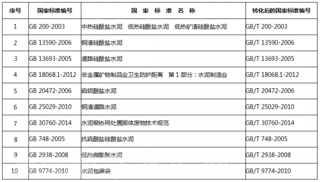 國家質檢總局和國家標準委同時發布公告,對水泥行業多項標準由強制性國家標準轉化為推薦性國家標準,產品涉及中熱硅酸鹽水泥、低熱硅酸鹽水泥、低熱礦渣硅酸鹽水泥、抗硫酸鹽硅酸鹽水泥、低熱微膨脹水泥、硫鋁酸鹽水泥、鋼渣道路水泥等多個產品,水泥制造業衛生防護距離以及水泥窯協同處置固體廢物技術規范等內容。