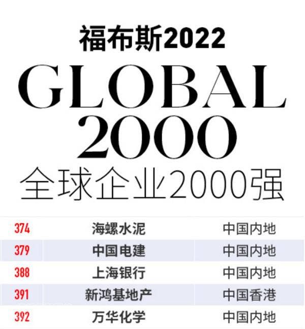 據(jù)福布斯5月12日最新發(fā)布的2022全球企業(yè)2000強榜單,海螺水泥再次上榜,位列374位。