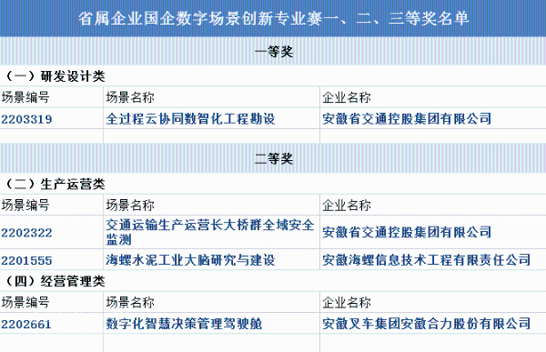 此次比賽中,安徽省屬企業共有1個應用場景獲得一等獎,3個應用場景獲得二等獎,6個應用場景獲得三等獎。