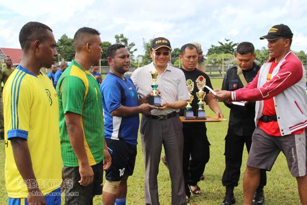 一波舞蹈高潮之后,首屆“海螺水泥杯”足球友誼賽總決賽拉開(kāi)戰(zhàn)幕。經(jīng)過(guò)緊張的爭(zhēng)奪,最終,PEMDA(縣政府代表隊(duì))隊(duì)以5:1的絕對(duì)優(yōu)勢(shì),力克對(duì)手,奪得冠軍。