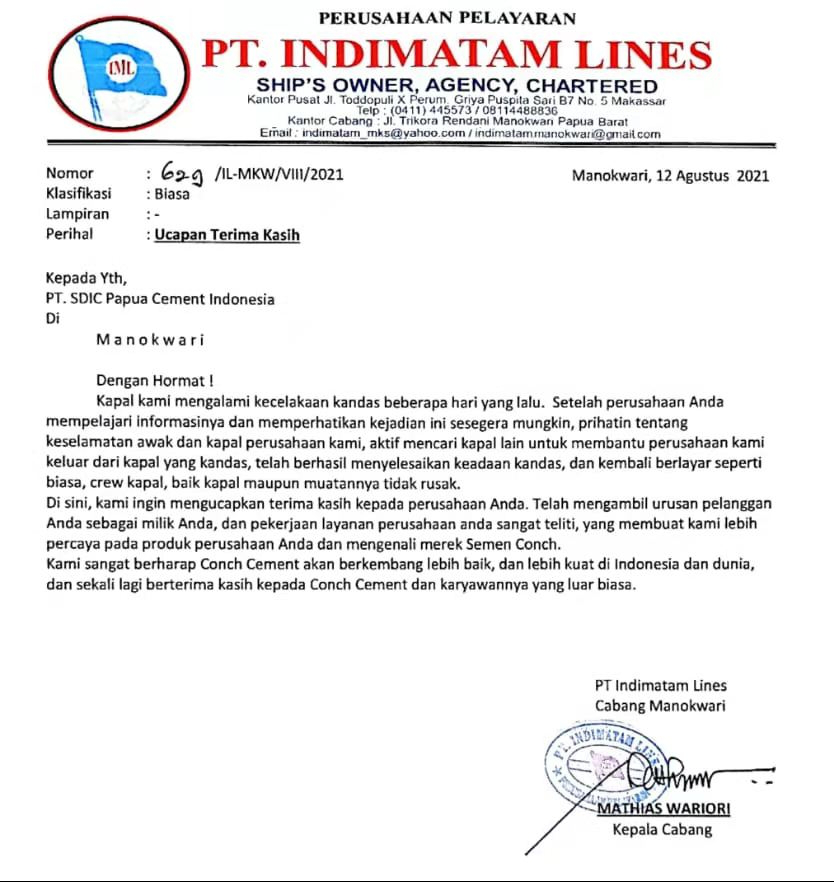2021年8月7日20時,印尼西巴海螺公司接到客戶的求助電話,其8月6日裝載離港的船只“INDINURMATALIA 07”在多雷里灣觸礁擱淺,客戶自提水泥貨物將面臨巨大損失,希望海螺給予幫助。