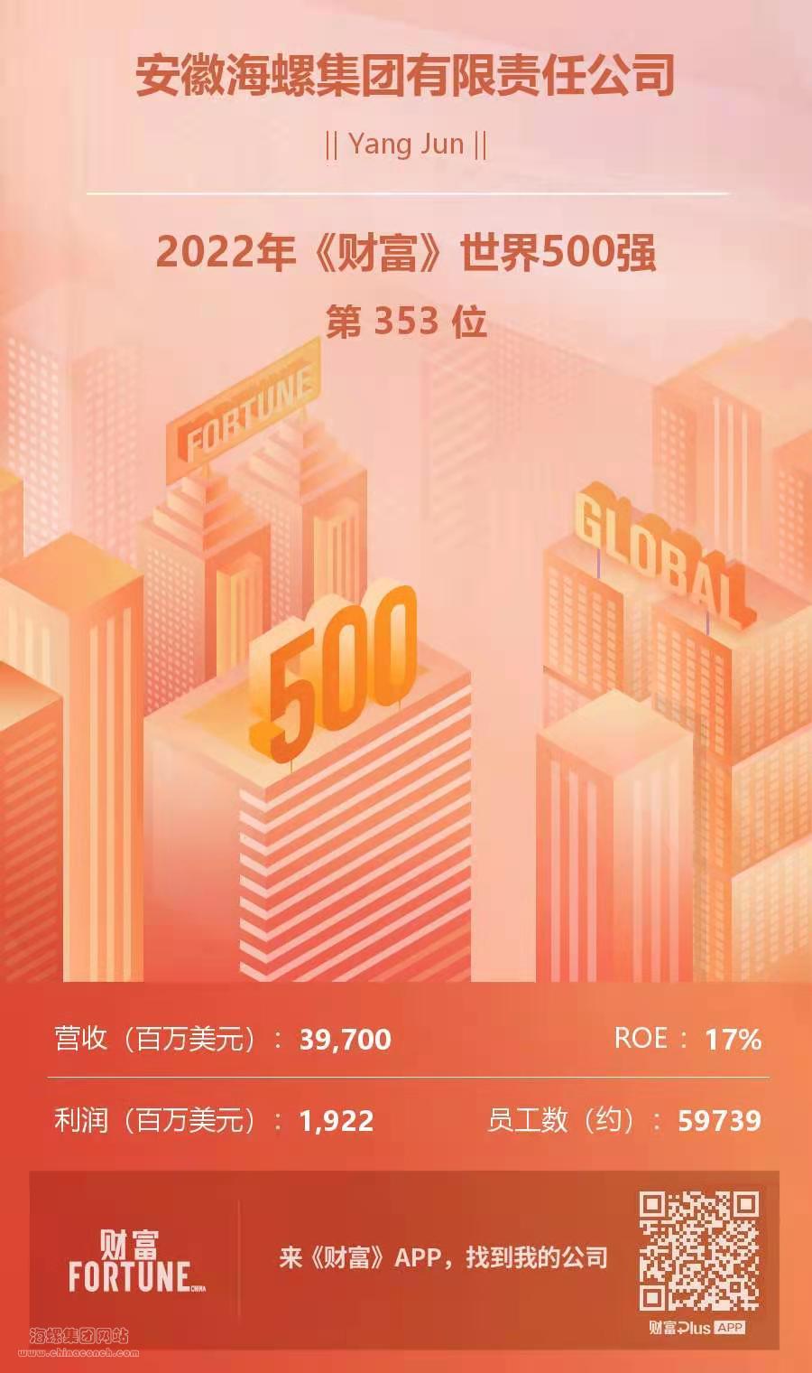 2022年8月3日,《財富》雜志公布“2022年世界500強企業(yè)”排名榜單,海螺集團以39,700百萬美元的營業(yè)收入位居第353位,連續(xù)4年進入世界500強。