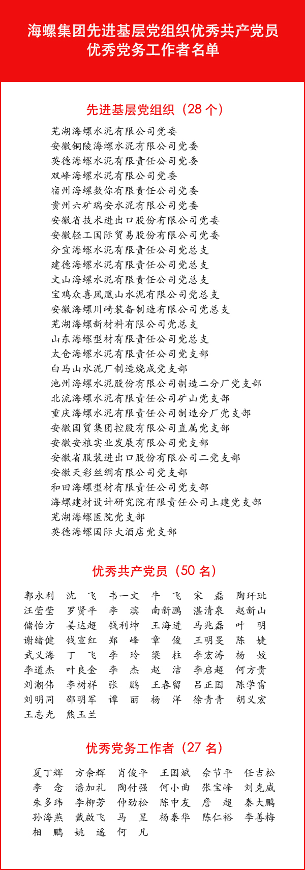 6月27日下午,集團黨委在總部隆重召開慶祝建黨98周年暨“兩優一先”表彰大會,慶祝中國共產黨98歲生日,集中表彰近兩年涌現出的先進基層黨組織、優秀共產黨員和優秀黨務工作者,深入開展先進典型教育,激勵各級黨組織和廣大黨員以先進為榜樣,不忘入黨初心,堅定發展信心,擔負職責使命,為加快實現“一帶一路”和“一強三冠”發展目標貢獻力量。 受表彰的先進基層黨組織、優秀共產黨員和優秀黨務工作者代表,集團黨政領導班子,集團直屬黨委領導班子,省內各企業黨委負責人以及機關部室負責人和黨員代表近200人現場參會。集團各子公司黨組織班子成員和黨群部門負責人以視頻方式參會。會議由集團黨委副書記、總經理任勇同志主持。 會議在莊嚴的國歌聲中拉開序幕。 集團公司黨委副書記齊生立同志宣讀了《關于表彰先進基層黨組織優秀共產黨員優秀黨務工作者的決定》,授予蕪湖海螺黨委等28個黨組織“先進基層黨組織”稱號;授予郭永利等50名同志“優秀共產黨員”稱號;授予夏丁輝等27名同志“優秀黨務工作者”稱號。 伴隨著激昂的音樂和熱烈的掌聲,集團黨委領導向受表彰的先進集體和先進個人頒發了獎牌和證書。 蕪湖海螺汪哲伍、蕪湖海螺新材料公司戴啟飛、安徽輕工公司王明旻、池州海螺郭永利四名同志分別代表先進基層黨組織、優秀黨務工作者、優秀共產黨員發言。他們表示要珍惜榮譽再出發,堅定理想信念,牢記黨的宗旨,以更加飽滿的工作熱情和高昂的工作斗志,在集團新一輪改革發展中建功立業。 集團黨委書記、董事長高登榜同志為全體黨員上了一堂形勢與政策課,并對進一步加強黨建工作提出要求。 他首先代表集團公司黨委,向受表彰的集體和個人表示熱烈的祝賀,向辛勤奮戰在公司各個崗位,尤其是生產一線和海外項目的廣大黨員致以節日的慰問。 他說,中國共產黨從嘉興南湖起航,開辟了一條中國特色航線。黨的十九大確立的習近平新時代中國特色社會主義思想,吹響了決勝全面建成小康社會、邁向社會主義現代化國家新征程的嘹亮號角,新時代中國特色社會主義航船再次揚帆起航,踏上中華民族偉大復興的征程。 他表示,在省委和省國資委黨委的領導下,集團黨委認真貫徹落實習近平新時代中國特色社會主義思想和黨的十九大精神,圍繞“黨建出凝聚力、黨建強戰斗力、黨建促發展力、黨建贏競爭力”,推動黨建與企業中心工作深度融合,在政治建設、工作體系、廉政建設和黨建成效上都取得了明顯成績,為集團公司經營發展提供了堅強保證。 他指出,當前國內外形勢發生深刻復雜變化,風險挑戰明顯增多,各級黨組織和廣大黨員要結合開展“不忘初心、牢記使命”主題教育,深入學習貫徹習近平新時代中國特色社會主義思想,深化對中央和省委各項決策部署的理解,準確把握當前集團公司面臨的各種形勢,切實增強工作的緊迫感和責任感,凝心聚力,拼搏實干,為集團公司又好又快發展作出新的更大貢獻。 他強調,要提高站位,扎實開展主題教育,以主題教育為契機,助力打造黨性修養有新提升、黨建工作有新提高、干部作風有新形象、企業發展有新突破的“四新工程”;要認真落實新時代黨的建設總要求,夯實基礎,推進基層黨組織全面進步、全面過硬;要深入學習領會中央紀委、省紀委全會和省國資委有關會議精神,認真落實黨風廉政建設黨委主體責任和紀委監督責任,持續鞏固“嚴強轉”專項行動成果,推動從嚴治黨向縱深發展;要加強群團建設,不斷提高新形勢下職工工作的針對性、有效性,切實為職工群眾做好事、辦實事、解難事,為企業改革發展凝聚強大合力;要落實責任,認真抓好巡視問題,注重舉一反三,進一步擴大整改成果,做好巡視整改“后半篇文章”;要認真總結上半年工作成效,對標查找工作中存在的不足,理清下半年工作思路和舉措,扎實有效地做好生產經營各項工作。 他號召,全體黨員要緊密團結在以習近平同志為核心的黨中央周圍,深入貫徹落實好中央、省委各項決策部署,以飽滿的政治熱情,良好的工作作風,勇于擔當的精神面貌,搶抓機遇、深化改革、加快發展,努力開創集團黨建工作新局面,奮力實現集團改革發展新突破,為把海螺建成具有全球競爭力的世界一流企業而努力奮斗。 任勇同志就貫徹此次會議精神提出要求,各單位要認真傳達,確保各項重點任務、具體要求落到實處;要大力宣傳先進基層黨組織的好經驗、好做法,宣傳優秀共產黨員的感人事跡和優秀品格,營造學先進、趕先進、爭先進的濃厚氛圍;領導干部要深入基層,切實抓好防暑降溫、安全環保、“七一”期間困難黨員的走訪慰問等工作,將集團黨委的關懷和要求落實到基層一線。 大會在嘹亮的國際歌中結束。