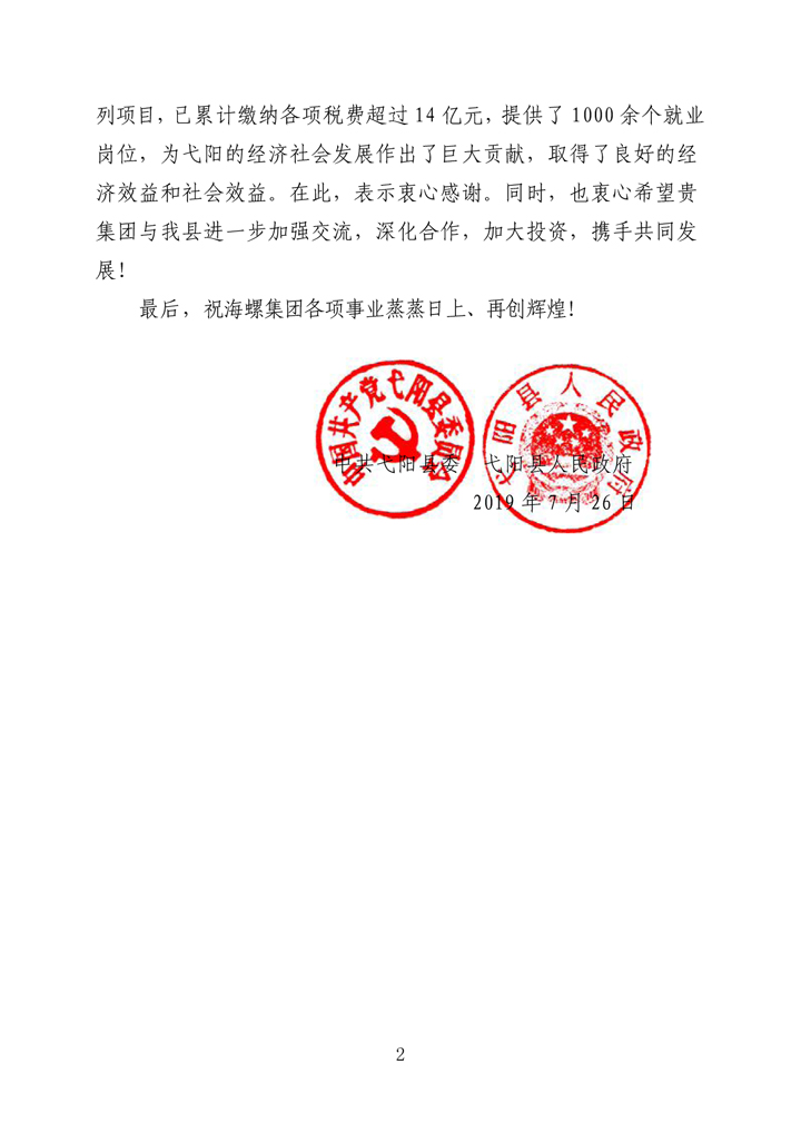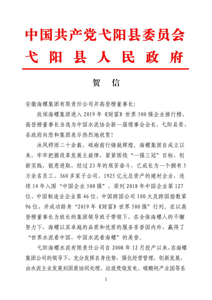 弋陽縣人民政府致海螺集團并高登榜董事長賀信
